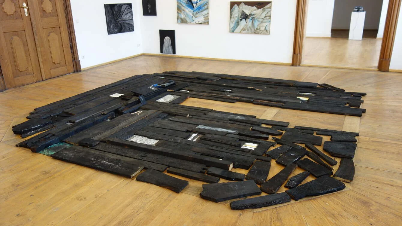 Contemporary art installation featuring a large arrangement of blackened wooden planks on a hardwood floor in an art gallery.